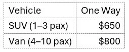 ✓ Flexible, multi-stop, all-day availability (up to 12 hours daily)