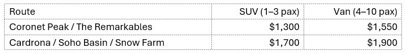 Queenstown’s most comfortable, flexible ski transport. Just you, your gear and the slopes!